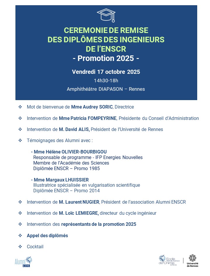 L’ENSCR organisera sa traditionnelle Cérémonie de remise des Diplômes ce Vendredi 17 octobre 2025 à partir de 14h30 dans l’amphithéâtre Diapason situé au 21 Allée Jules Noël sur le Campus de Beaulieu à Rennes.