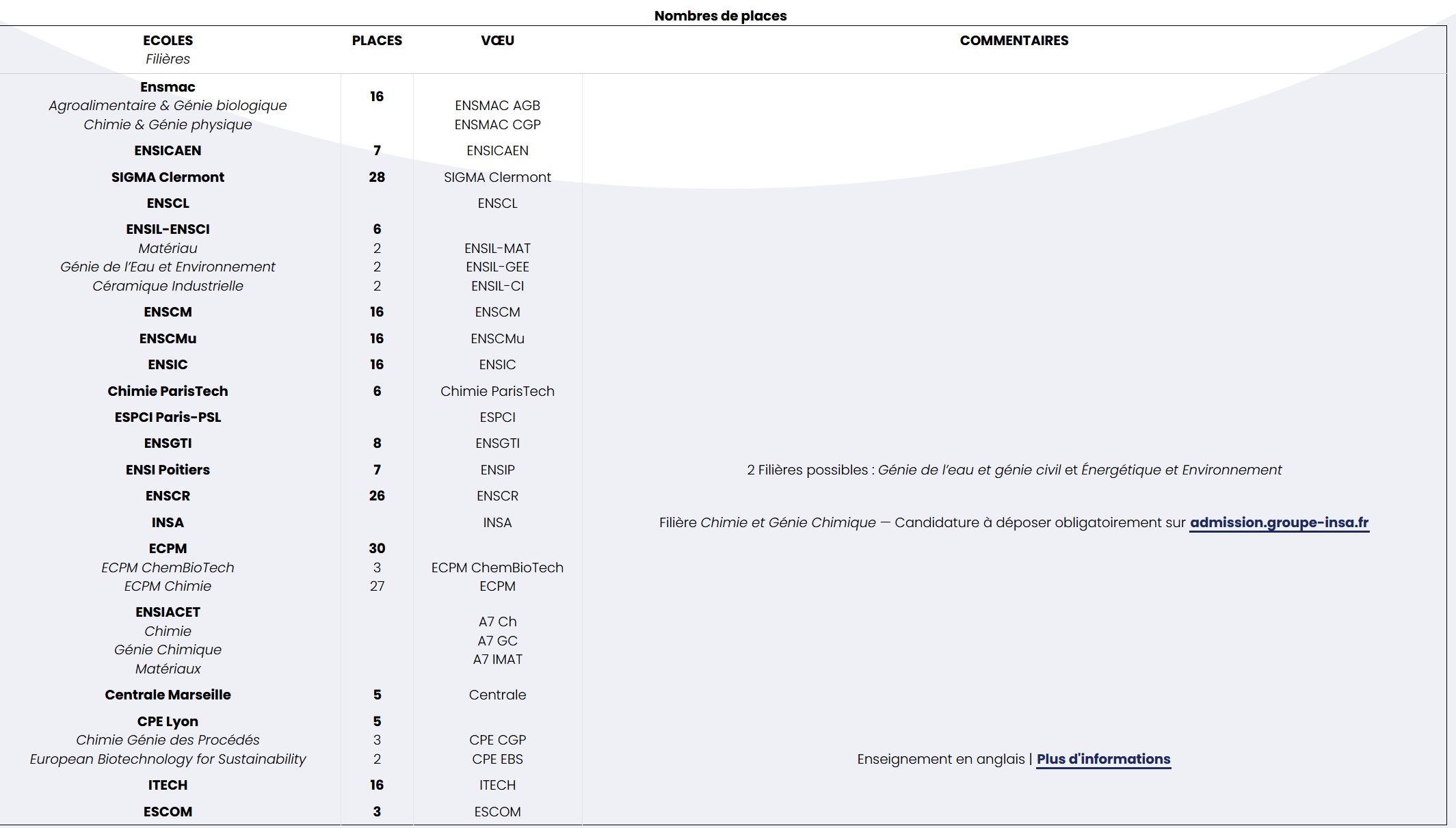 - La FGL c’est 20 Écoles mais vous avez 26 vœux à effectuer (deux choix pour l’ECPM, trois pour l’ENSIACET, trois pour l’ENSIL-ENSCI et deux choix pour l’Ensmac). Considérez que les 22 premiers vœux sont des affectations potentielles.
