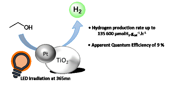 Based on our skills in the deposition of metal nanoparticles on various supports, we studied the preparation of TiO2 decorated photocatalysts as efficient materials for the green hydrogen production. The use of alcohols as liquid organic hydrogen carriers (LOHCs) for the production of clean H2 through their oxidative dehydrogenation has been optimized allowing an unprecedented hydrogen production rate.